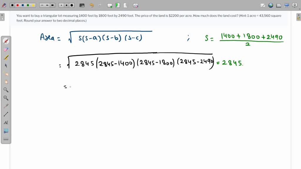 Solved You Want To Buy A Triangular Lot Measuring 1400 Feet By 1800 Feet By 2490 Feet The Price Of The Land Is 2200 Per Acre How Much Does The Land Cost